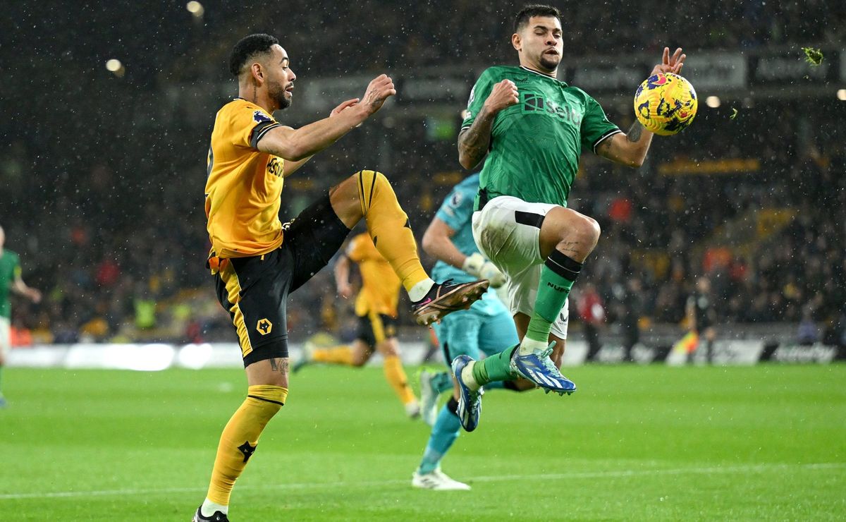 Estamos falando dos jogadores Bruno Guimarães e Matheus Cunha. Eles estão se enfrentando no jogo entre Newcastle e Wolverhampton, pelo campeonato inglês. O volante Bruno defende o Newcastle, enquanto o atacante Cunha está pelo lado amarelo dos Wolves.