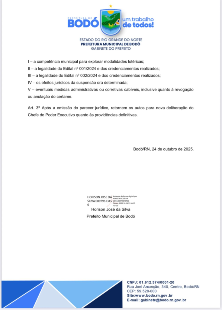A Prefeitura de Bodó, no Rio Grande do Norte, decidiu suspender, com base em análise técnica jurídica, as atividades da Loteria Municipal de Bodó (LOTSERIDÓ) – incluindo credenciamento, contratos e operações decorrentes do Edital de Credenciamento nº 001/2024 e do Edital de Credenciamento 002/2024 – até nova deliberação do Poder Executivo Municipal.