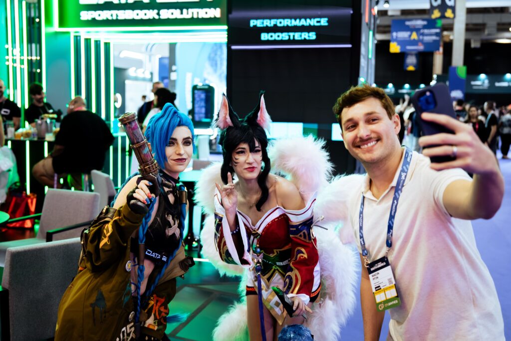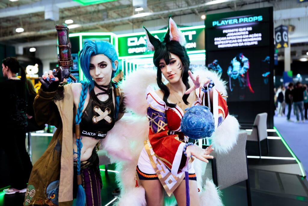 Cosplayers vestidas como Jinx e Ahri, personagens favoritas dos fãs de League of Legends, atraíram atenção constante durante todo o evento, enquanto uma tela cinética adicionou um elemento visual interativo que manteve o público engajado.