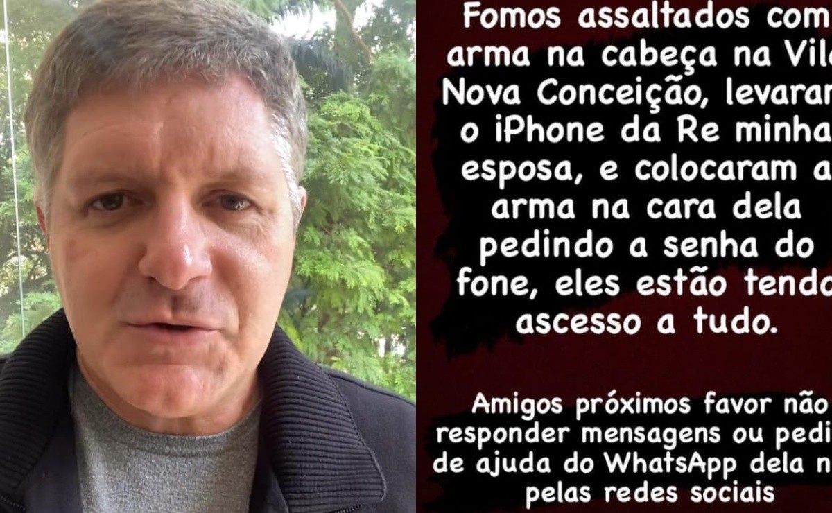 “Fomos assaltados com arma na cabeça na Vila Nova Conceição. Levaram o iPhone da Rê, minha esposa, e colocaram arma na cara dela pedindo a senha do fone. Eles estão tendo acesso a tudo. Amigos próximos, favor não responder mensagens ou pedido de ajuda no WhatsApp dela nem pelas redes sociais”, afirmou o famoso em seu Instagram.
