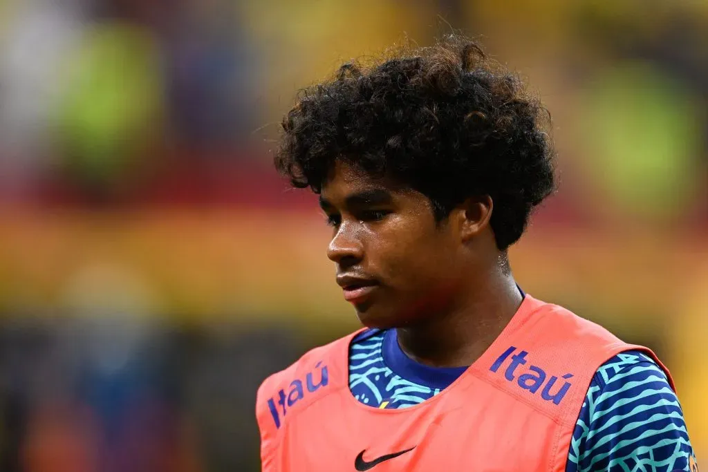 Endrick jogador do Brasil aquecimento antes da durante partida contra o Peru no estadio Mane Garrincha pelo campeonato Eliminatorias Copa Do Mundo 2026. Foto: Mateus Bonomi/AGIF