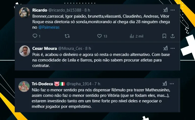 Por fim, mesmo que Matheuzinho tenha sido destaque em 2024 e fundamental na Série A, os palmeirenses gostariam de contratações de maior peso, como Oscar e Neymar, jogadores repatriados por SPFC e Santos, respectivamente. Confira a opinião dos palmeirenses sobre o meia do Rubro-Negro Baiano:”}]]