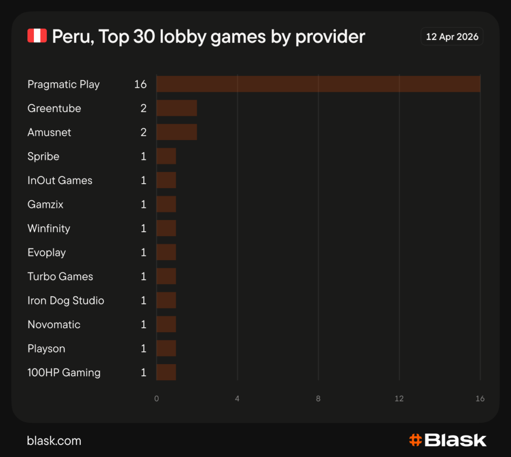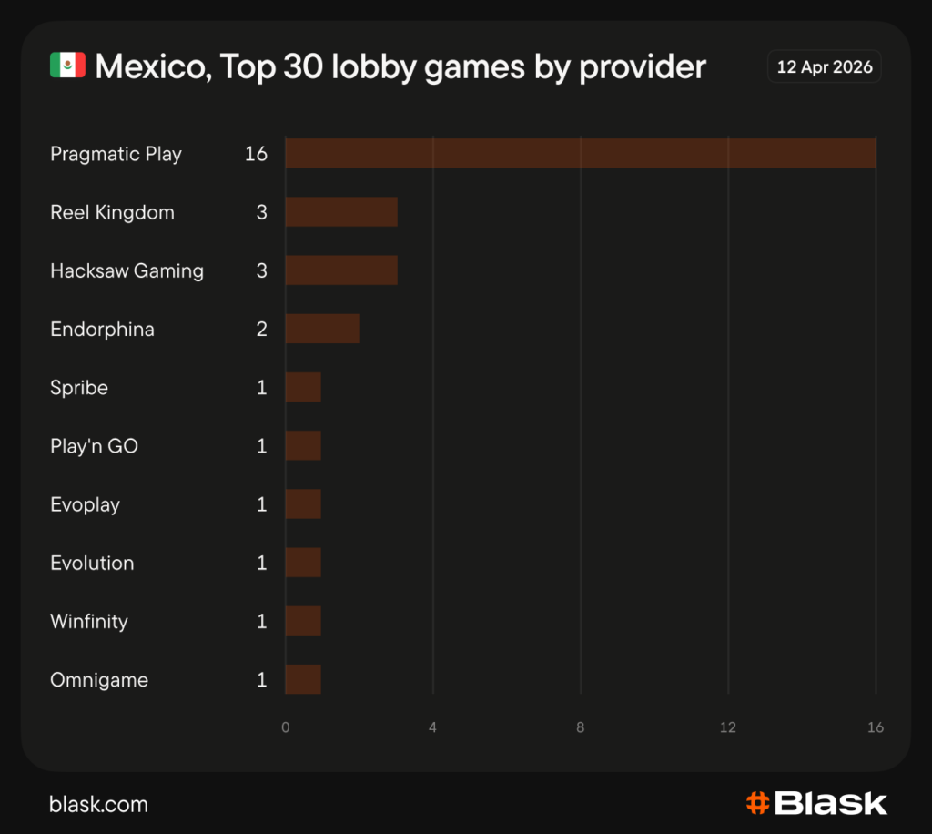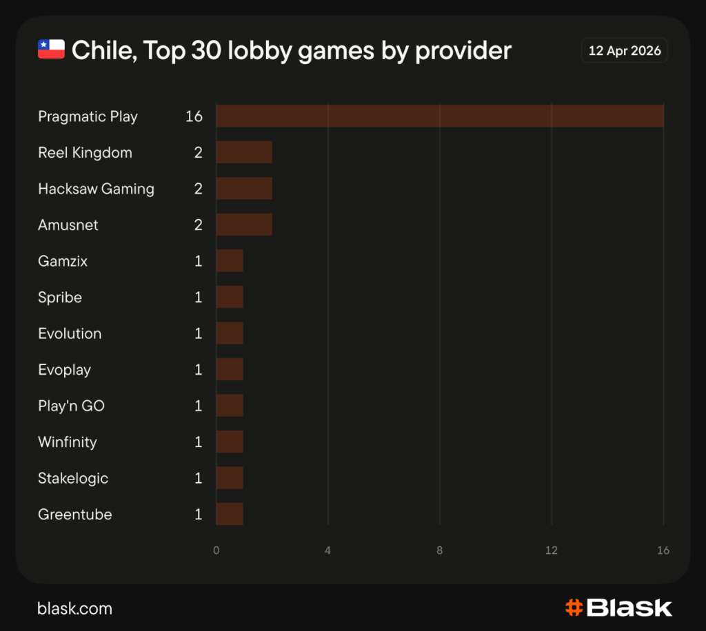 Embora mantenha a mesma linha de base da Pragmatic, ele distribui as posições restantes entre 12 provedores diferentes, muitos dos quais não aparecem em nenhum outro mercado latino-americano analisado.