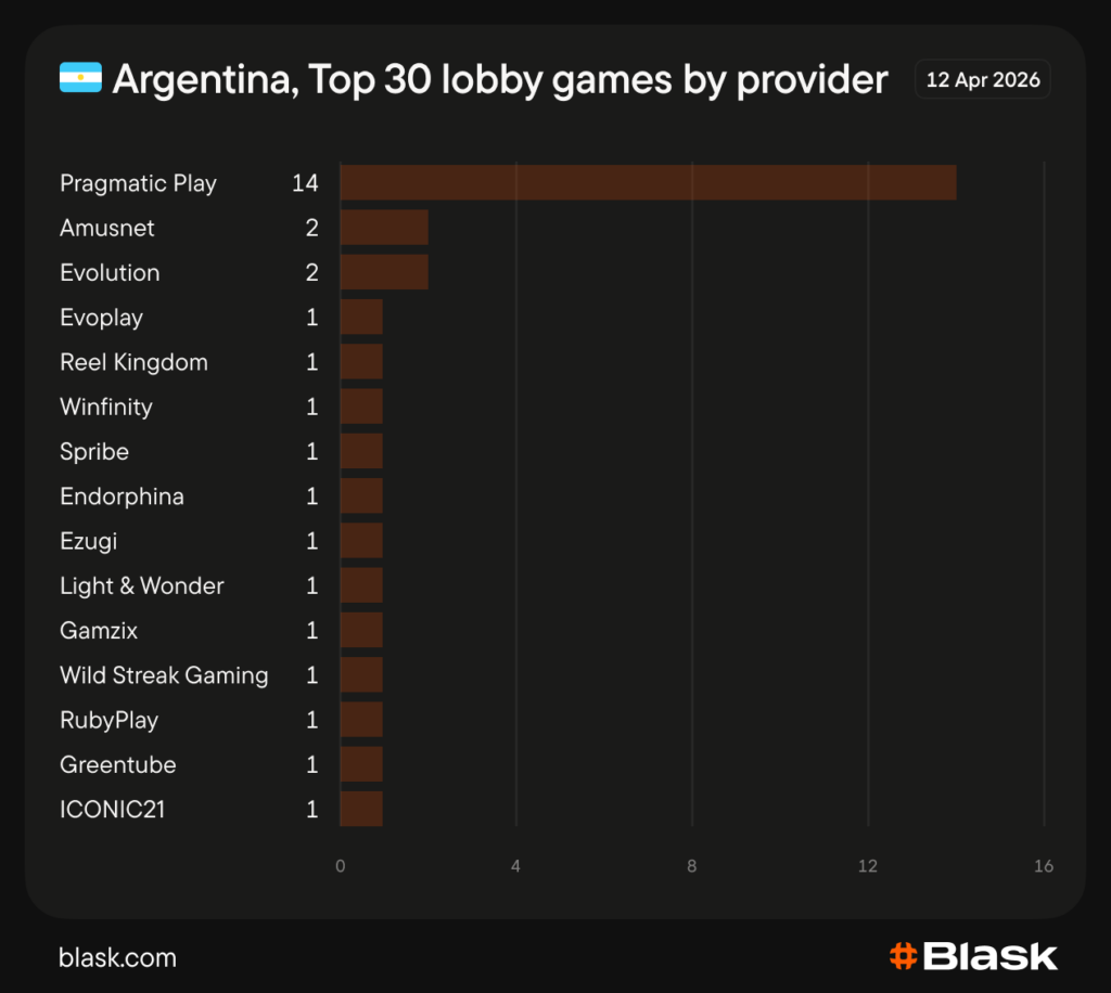 Ao contrário dos mercados vizinhos, onde um punhado de fornecedores domina, a Argentina distribui a visibilidade por uma ampla gama de estúdios, particularmente nos segmentos de cassino ao vivo e jogos de mesa.
