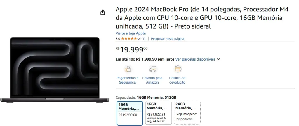 Tá vendo essa belezinha aqui? Então, é o MacBook Pro M4, o creme de la creme dos notebooks. Com ele, você tem um laptop completo, poderoso, com chip M4, processamento e eficiência de referência no mercado. Use os softwares mais avançados sem sofrer com entrega. A bateria dura até 24 horas, e a tela é um pouco maior do que as do MacBook Air, com 14 polegadas. Não há muitos argumentos que não sejam “este é o melhor laptop disponível pra comprar no mundo”.