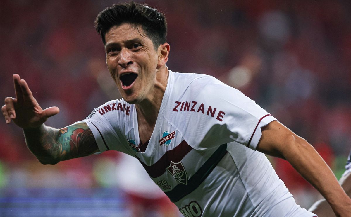 Jogadores do Fluminense comemoram vitoria ao final da partida contra o Internacional no estadio Beira-Rio pelo campeonato Libertadores 2023. Foto: Maxi Franzoi/AGIF