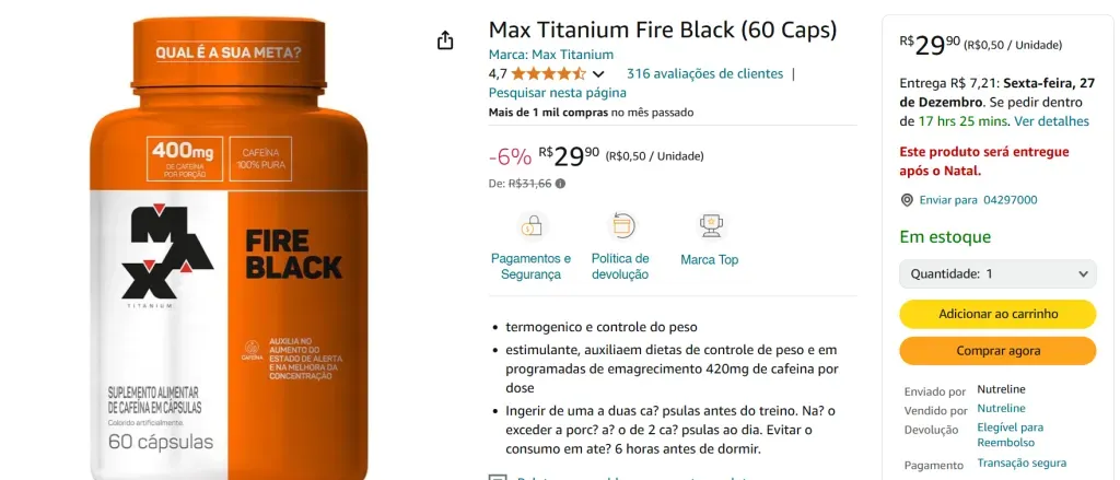 Uma alternativa é o Max Titanium Fire Black, com 60 cápsulas, que proporciona uma média de 420mg de cafeína pura por dose. É como estar ligado no 220v durante o dia. Está precisando dar um gás no treino ou nas tarefas do trabalho, com concentração? Então esse aqui serve bem para o propósito.