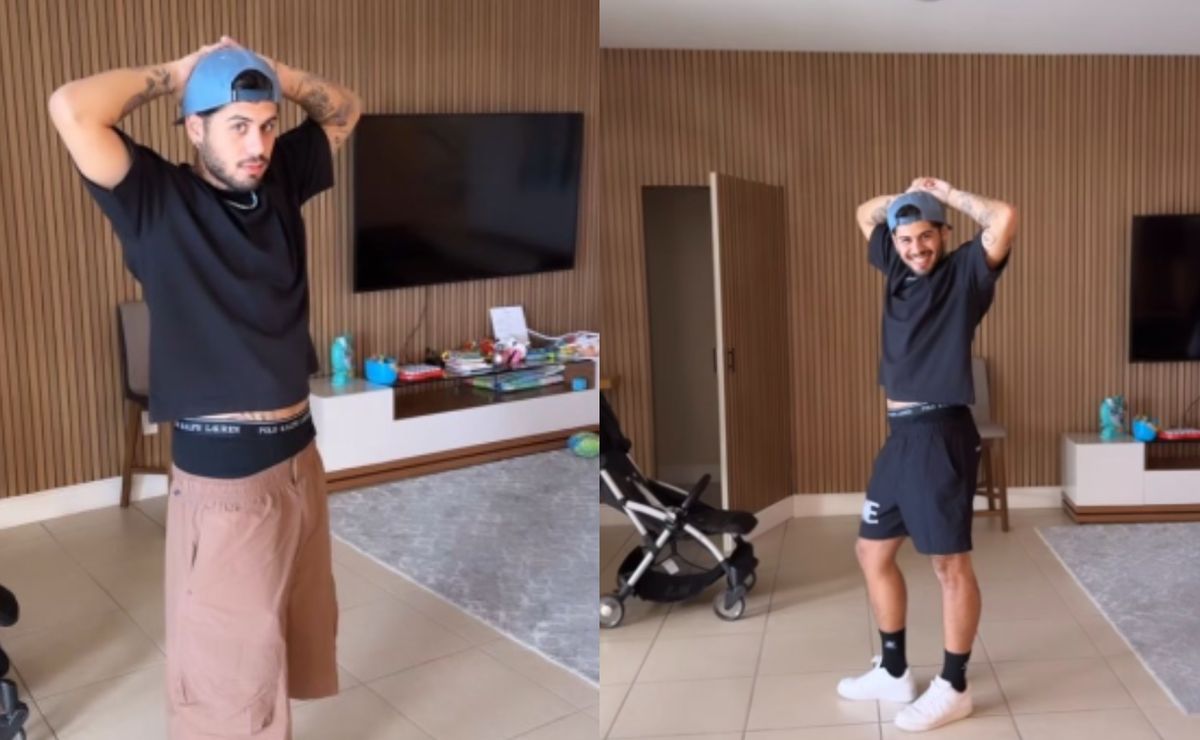 Zé deixou a cueca à mostra para tentar esconder a barriga, mas a tática do cantor só piorou a situação. “Para dar um tchan, né? Ela é um cropped, mas é diferente“, defendeu o filho do cantor Leonardo.