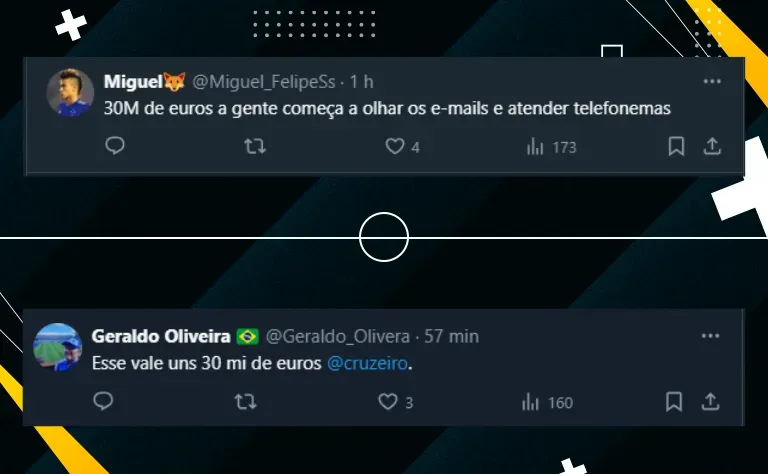 Por fim, mesmo tendo visto pouco do jogador, a informação fez a torcida do Cruzeiro estipular possíveis valores para negociá-lo. Pelo Clube não estar “enforcado” financeiramente, a quantia que mais apareceu foi de 30 milhões de euros. Confira: